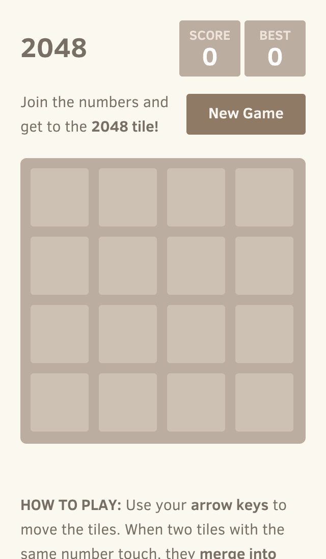 Instructions: Use your arrow keys to move the tiles. When two tiles with the same number touch, they merge into one! You can continue to play further to form 2048 tiles!